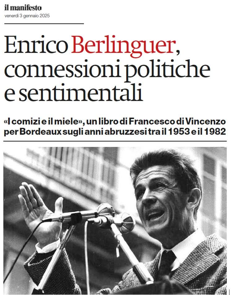 Il seguente articolo di Lelio La Porta è atat pubblicato sul numero de “il Manifesto” del 3 gennaio 2025. Si tratta della recensione del testo «I comizi e il miele», di Francesco di Vincenzo per Bordeaux Edizioni, sugli anni abruzzesi tra il 1953 e il 1982 del segretario del PCI Enrico Berlinguer.